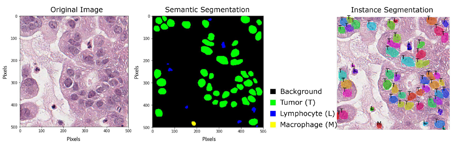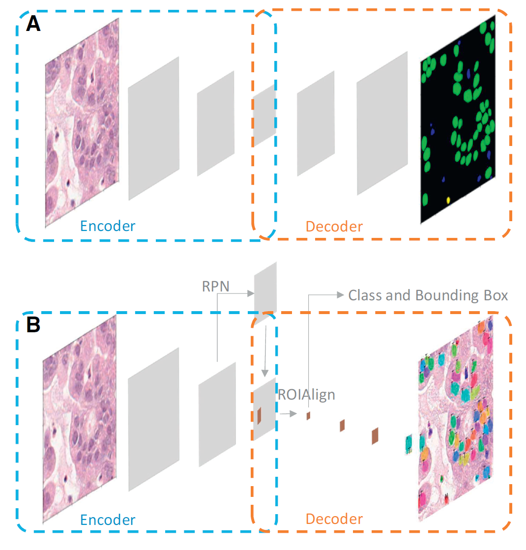 - 2) instance segmentation, which detects the region of interest (ROI) for each instance first, then classification and segmentation are applied to the same ROI in parallel (ex. Mask R-CNN).